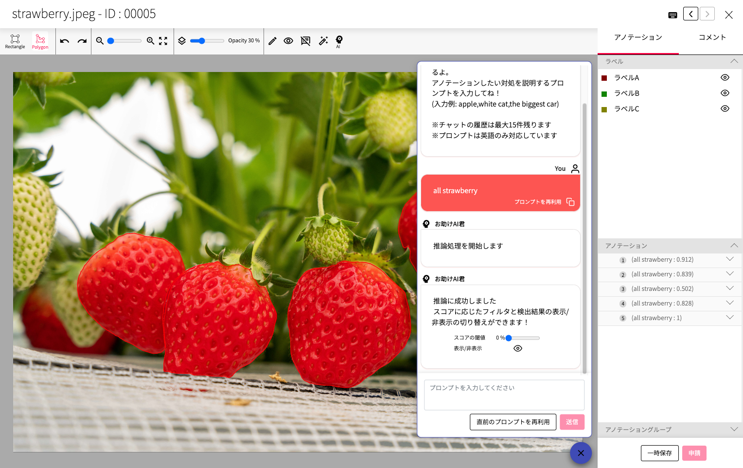 AI が検出したラベルに対して、AI のスコアに応じたフィルタリングを行うことが可能です。例えば下記の画像を AI アノテーションした場合、それぞれのラベルに対する AI のスコアが、画面赤枠に記載されています。